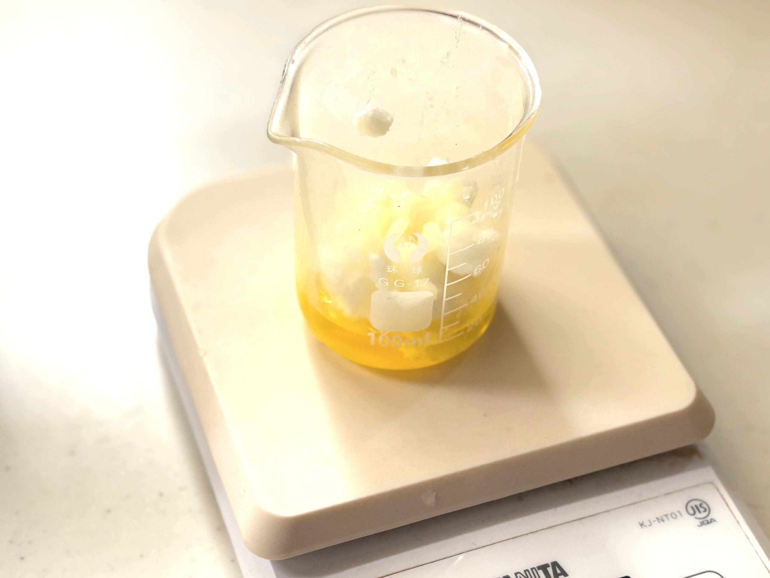 耐熱容器にシアバター、ミツロウ、キャリアオイルを入れ、湯煎にかけてゆっくりと溶かします。ミツロウが完全に溶けたら湯煎からおろします。